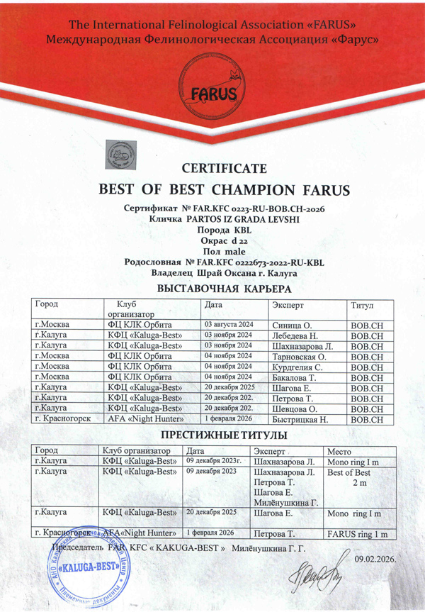 6 оценок BOBCH от разных судей, полученных только на выставках FARUS (ФАP). Причем, из шести оценок необходимо получить три на выезде в разных городах.