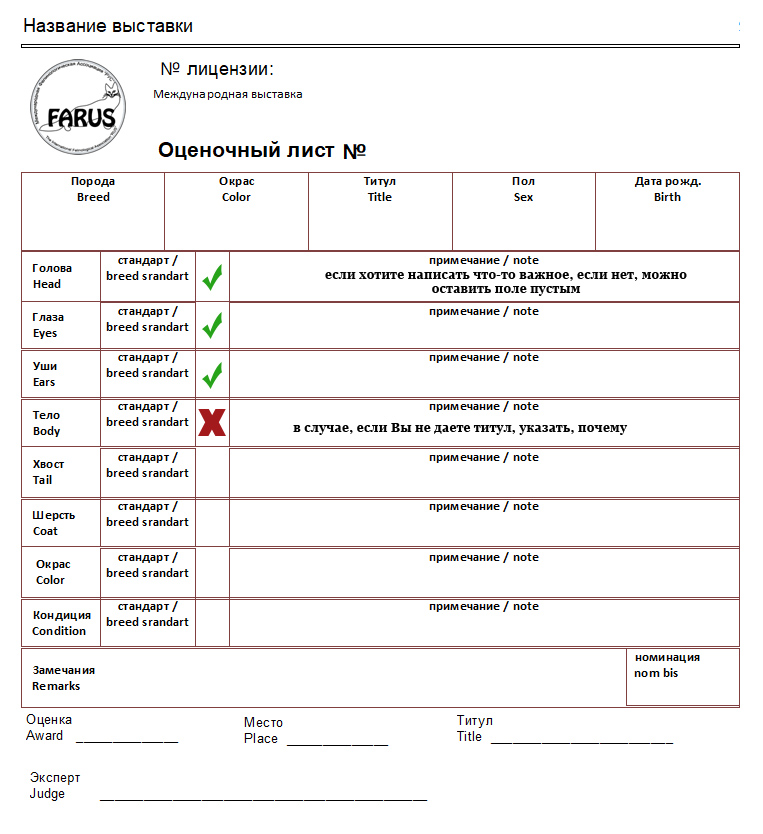Также клубы могут использовать старые формы оценочного листа. В этом случае Эксперты АВ могут писать одно слово "стандарт" в графе описание, если кошка соответствует стандарту породы.
